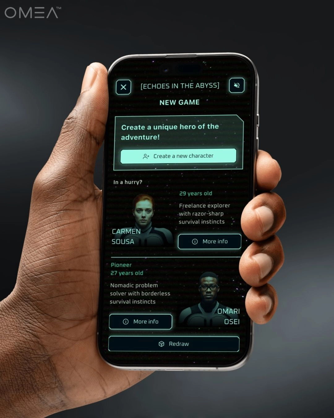 OMEA tworzy nową kategorię gier, w których to gracz, za pomocą swojego głosu, w czasie rzeczywistym kształtuje fabułę o jakości porównywalnej z produkcjami HBO. AI Game Master generuje świat i interakcje na podstawie tego, co mówi użytkownik. "No menus, no limits – just speak and shape your story."